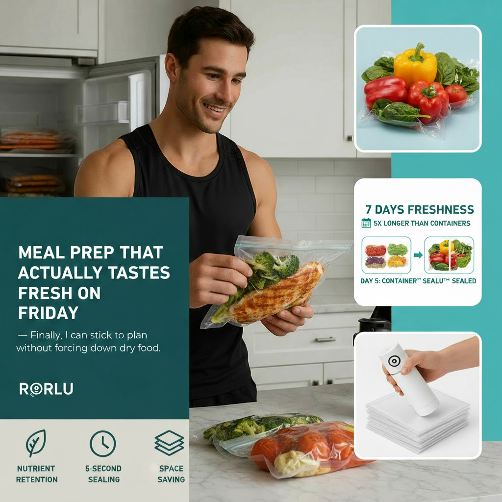 Containers trap air that breaks down your food, leaving chicken rubbery and vegetables brown. Rorlu™ solves this in just 5 seconds, vacuum sealing each meal for 7+ days of peak freshness.